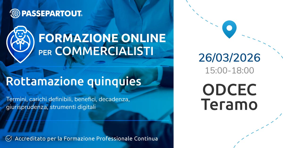Il 26 marzo è in programma un webinar dal titolo "Rottamazione quinquies", in collaborazione con l'ODCEC di Teramo, valido al fine della formazione professionale continua.