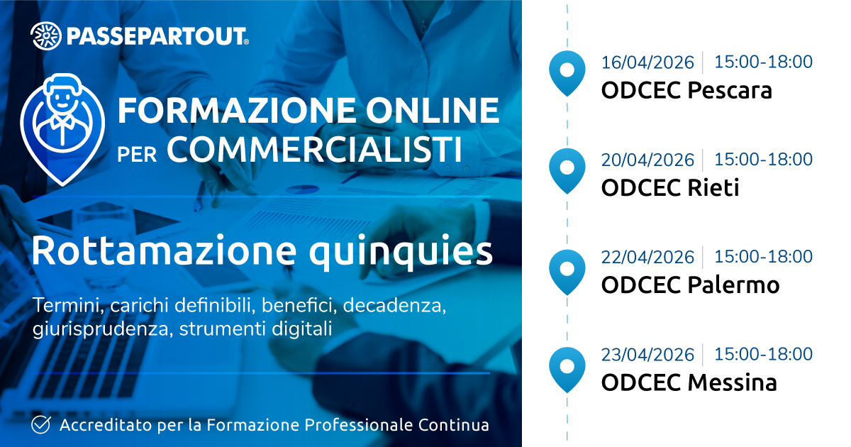 Il 16, 20, 22 e 23 aprile sono in programma i webinar dal titolo "Rottamazione quinquies", in collaborazione con l'ODCEC di Pescara, Rieti, Palermo e Messina valido al fine della formazione professionale continua.